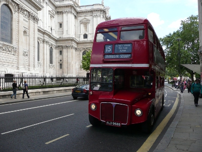 旧型のロンドンバスは、ドアがなく、後ろ側から乗り込むクラシックタイプ。